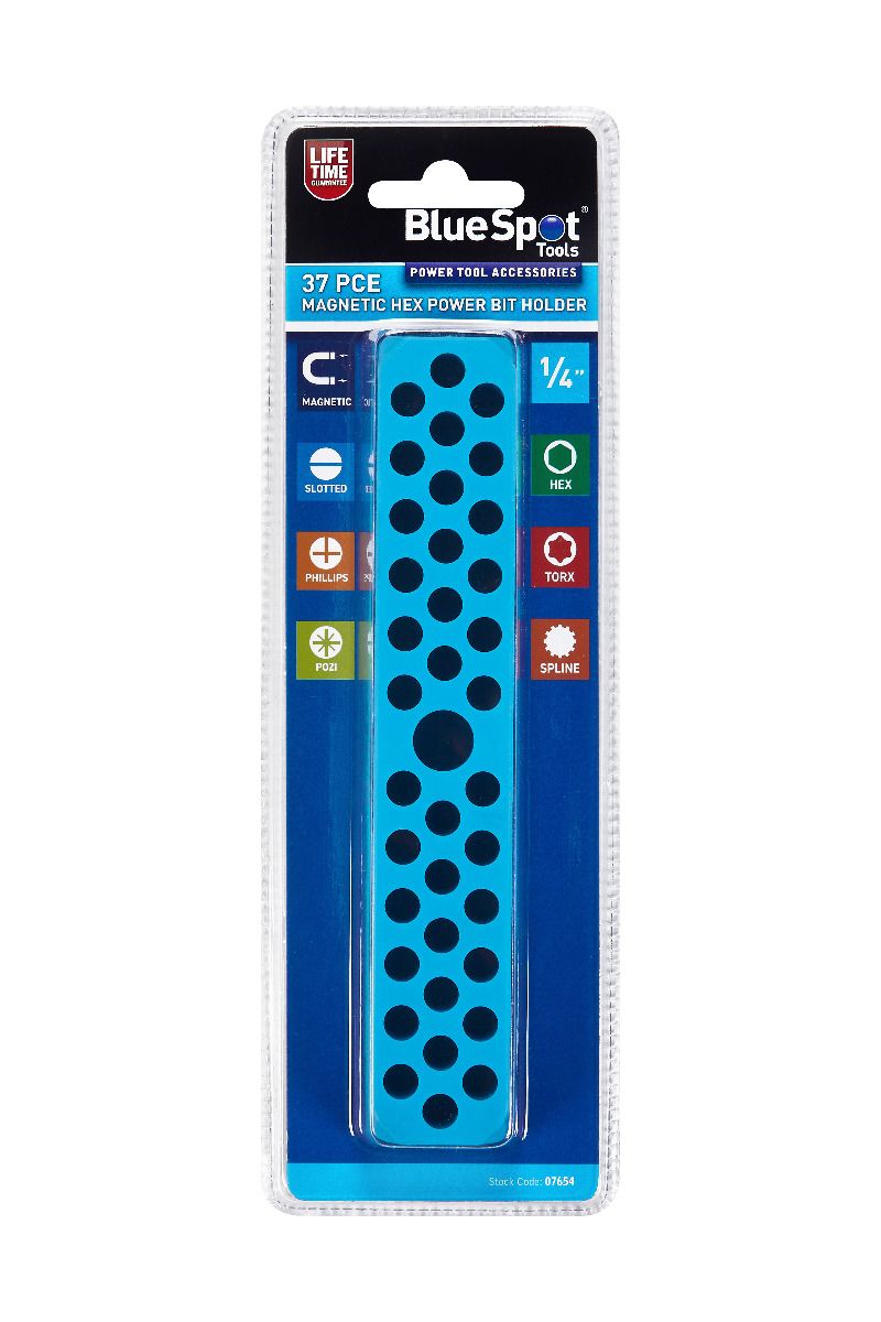 The Blue Spot Tools 37 PCE magnetic hex power bit holder is manufactured from high quality plastic for increased durability. Ideal for keeping Phillips Pozi Slotted , Hex Torx and Spline bits organised, safe and secure while working.